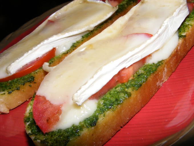 Preheat grill to medium. Drizzle the bread slices with oil, then grill about 1 minute per side. Remove bread from grill. Spread each slice with some of the pesto. Add a layer of sliced tomato and a piece of Brie. Grill about 1 minute more, until cheese melts and the bread is nicely toasted.